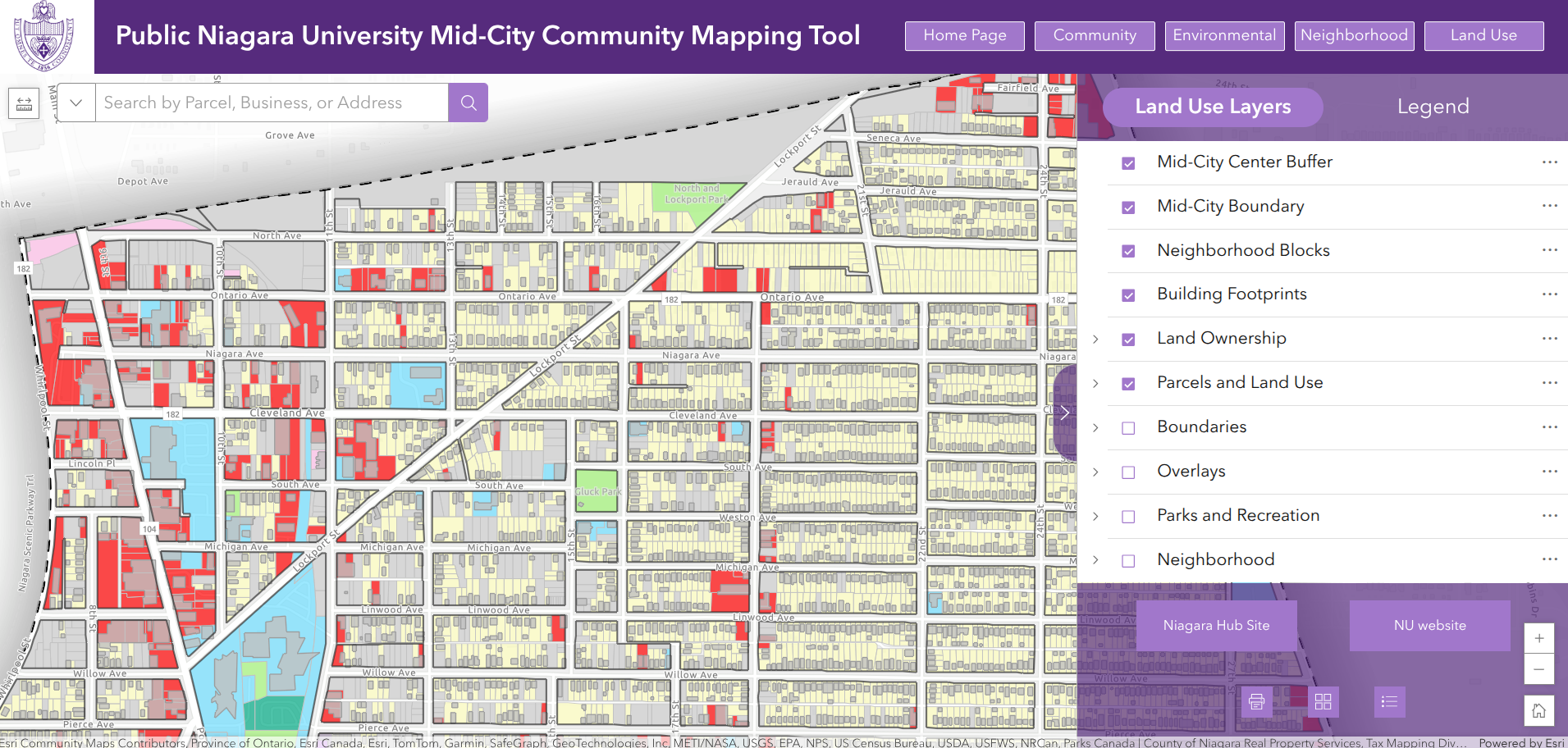 The Public Niagara University Mid-City Community Mapping Tool provides a wide range of datasets grouped into four thematic categories: Community, Environmental, Neighborhood, and Land Use